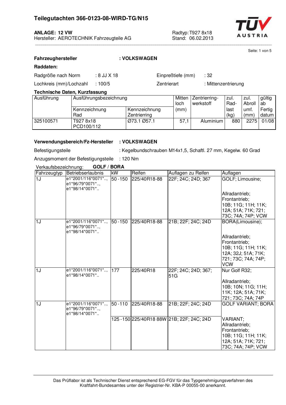 Dieses Gutachten (teilegutachten) bezieht sich auf die Alufelge ATS T927 8x18 in der Ausführung 8Jx18 ET 0, Mittenloch 0 mm . Im PDF findest du typischerweise zulässige Reifengrößen, Auflagen/Anbauhinweise und – je nach Dokument – Hinweise zur Eintragung.