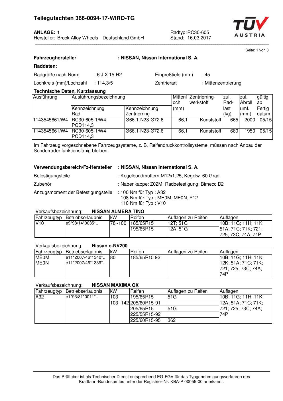 Felgengutachten / teilegutachten für Alufelgen Brock RC30 -605 (6Jx15 ET 0, Mittenloch 0 mm) (Zertifikatsnummer beschriebene). Hier kostenlos als PDF herunterladen. Der Download-Link ist 24 Stunden gültig und kann bis zu zwei Mal verwendet werden.
