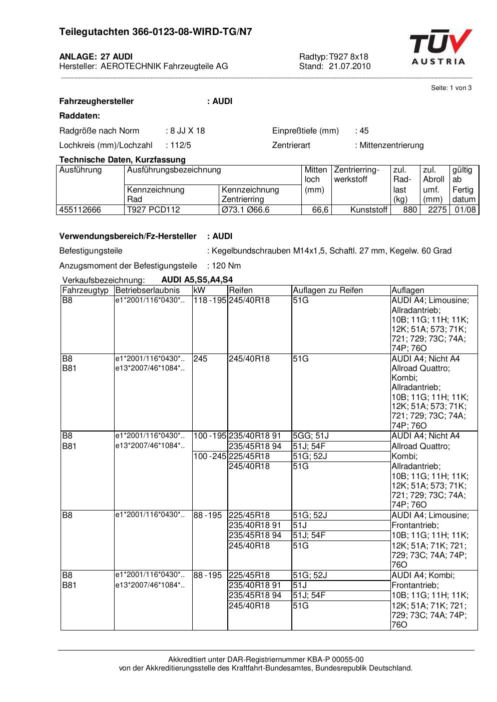 teilegutachten beschriebenen ATS T927 8x18