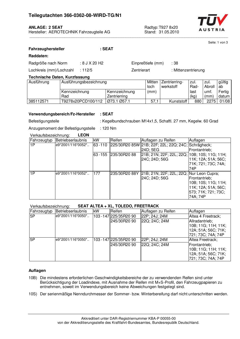 teilegutachten beschriebenen ATS T927 8x20