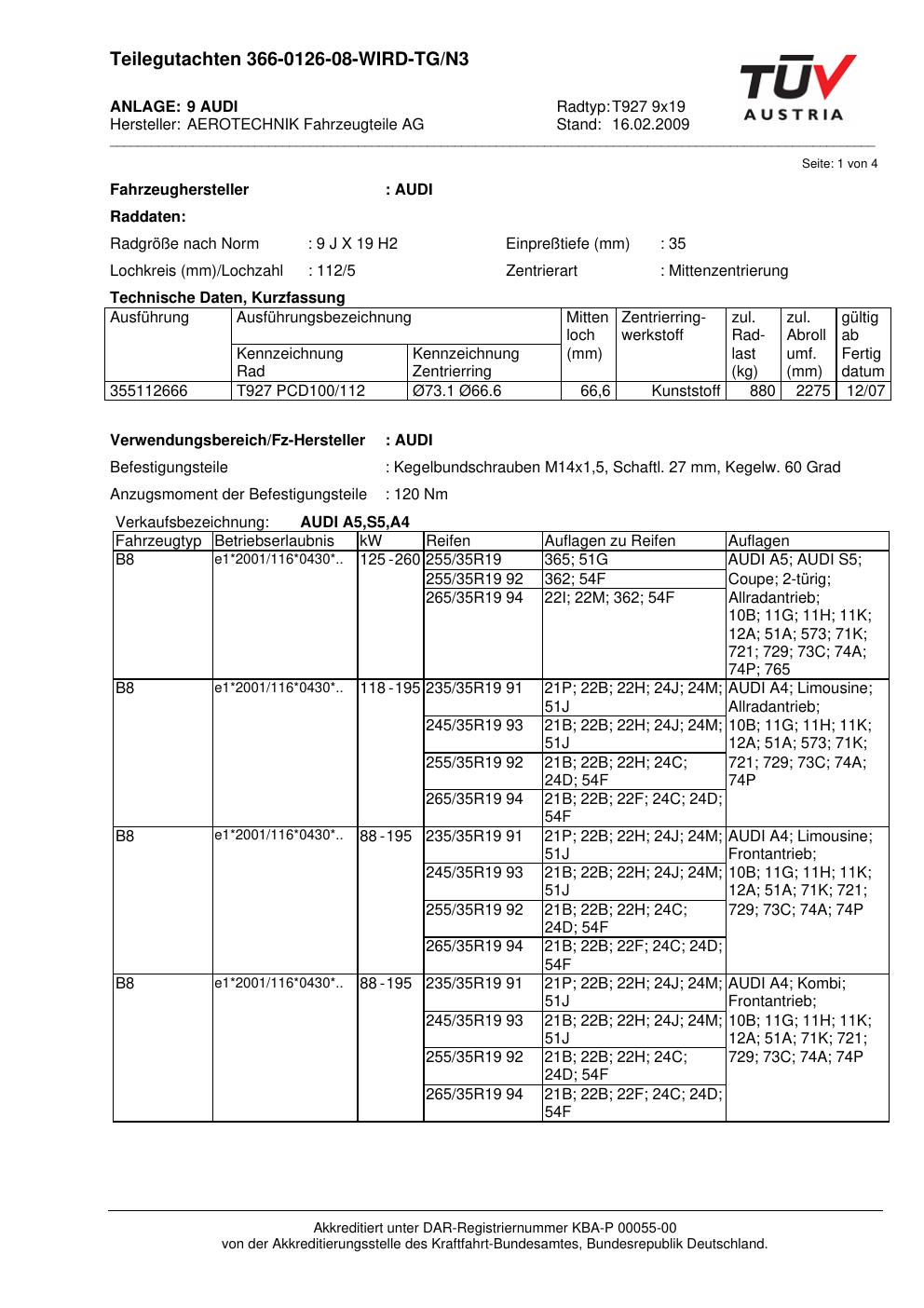Dieses Gutachten (teilegutachten) bezieht sich auf die Alufelge ATS T927 9x19 in der Ausführung 9Jx19 ET 0, Mittenloch 0 mm . Im PDF findest du typischerweise zulässige Reifengrößen, Auflagen/Anbauhinweise und – je nach Dokument – Hinweise zur Eintragung.