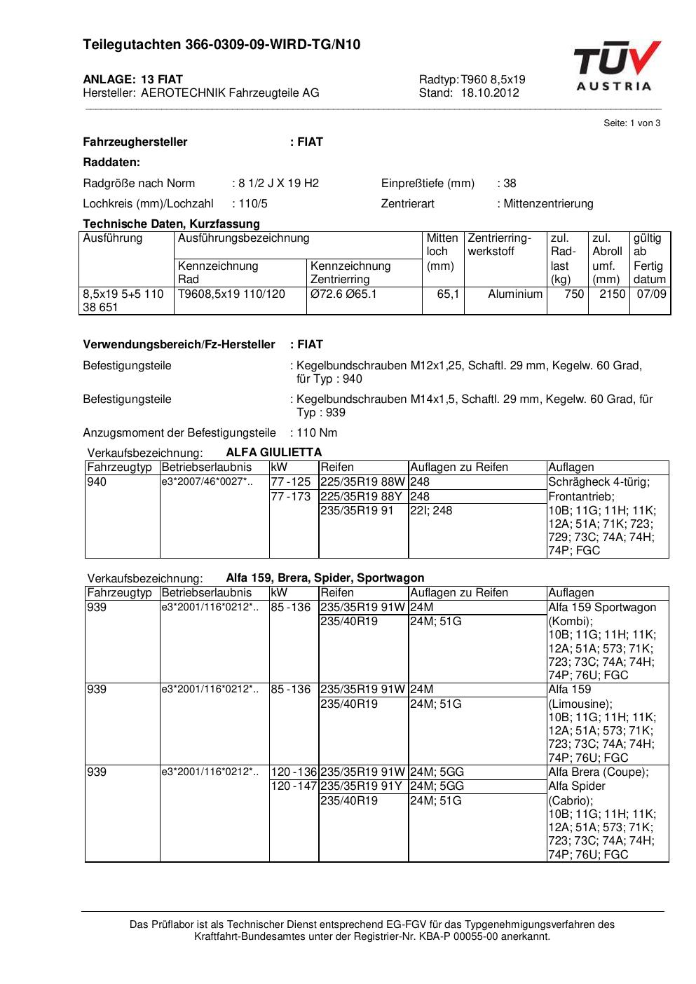 Felgengutachten / teilegutachten für Alufelgen ATS T960 8 (8.5Jx19 ET 0, Mittenloch 0 mm) (Zertifikatsnummer beschriebenen). Hier kostenlos als PDF herunterladen. Der Download-Link ist 24 Stunden gültig und kann bis zu zwei Mal verwendet werden.
