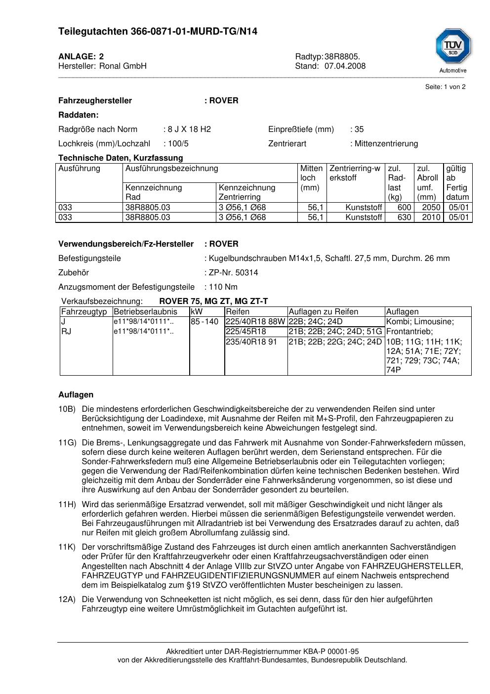 teilegutachten beschriebenen Ronal 38R8805