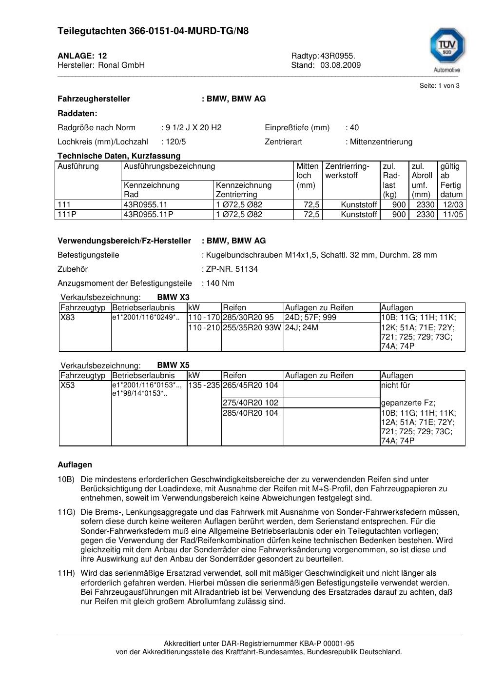 Dieses Gutachten (teilegutachten) bezieht sich auf die Alufelge Ronal 43R0955 in der Ausführung 2Jx2 ET 0, Mittenloch 0 mm . Im PDF findest du typischerweise zulässige Reifengrößen, Auflagen/Anbauhinweise und – je nach Dokument – Hinweise zur Eintragung.