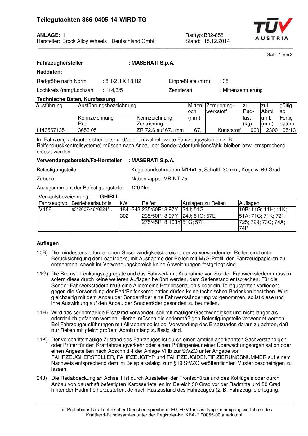 Dieses Gutachten (teilegutachten) bezieht sich auf die Alufelge Brock B32-858 in der Ausführung 2Jx18 ET 0, Mittenloch 0 mm . Im PDF findest du typischerweise zulässige Reifengrößen, Auflagen/Anbauhinweise und – je nach Dokument – Hinweise zur Eintragung.