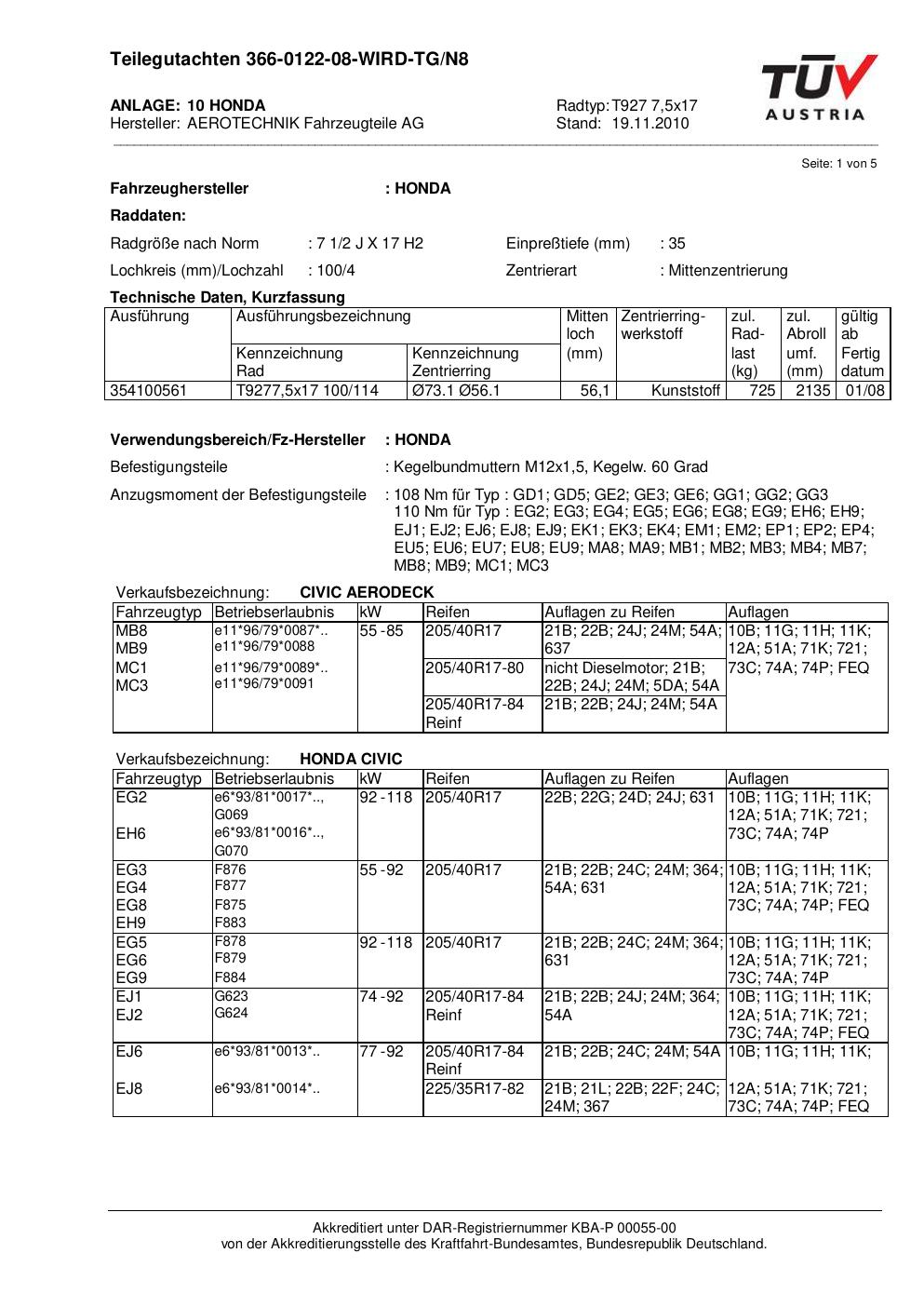 Felgengutachten / teilegutachten für Alufelgen co-rod T927 7 (7.5Jx17 ET 0, Mittenloch 0 mm) (Zertifikatsnummer beschriebenen). Hier kostenlos als PDF herunterladen. Der Download-Link ist 24 Stunden gültig und kann bis zu zwei Mal verwendet werden.