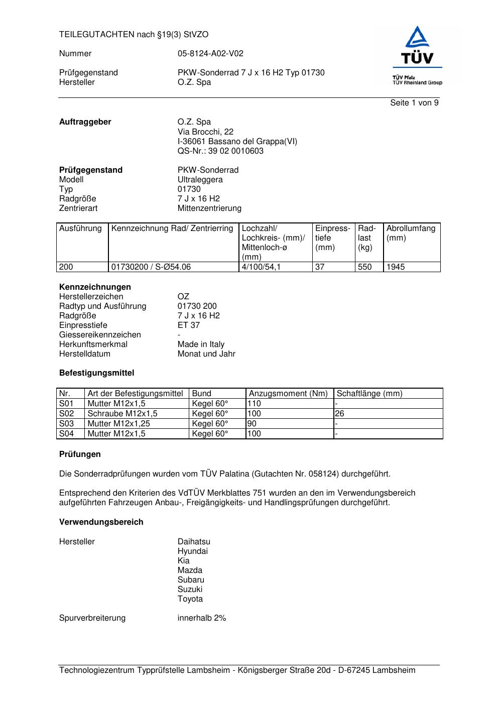 Dieses Gutachten (teilegutachten) bezieht sich auf die Alufelge ATS 01730 in der Ausführung 7Jx16 ET 0, Mittenloch 0 mm . Im PDF findest du typischerweise zulässige Reifengrößen, Auflagen/Anbauhinweise und – je nach Dokument – Hinweise zur Eintragung.