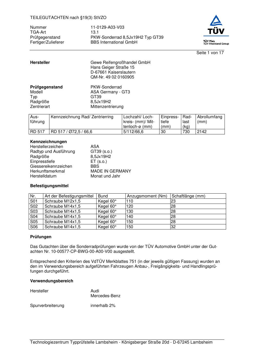 Dieses Gutachten (teilegutachten) bezieht sich auf die Alufelge BBS GT39 in der Ausführung 8.5Jx19 ET 0, Mittenloch 0 mm . Im PDF findest du typischerweise zulässige Reifengrößen, Auflagen/Anbauhinweise und – je nach Dokument – Hinweise zur Eintragung.
