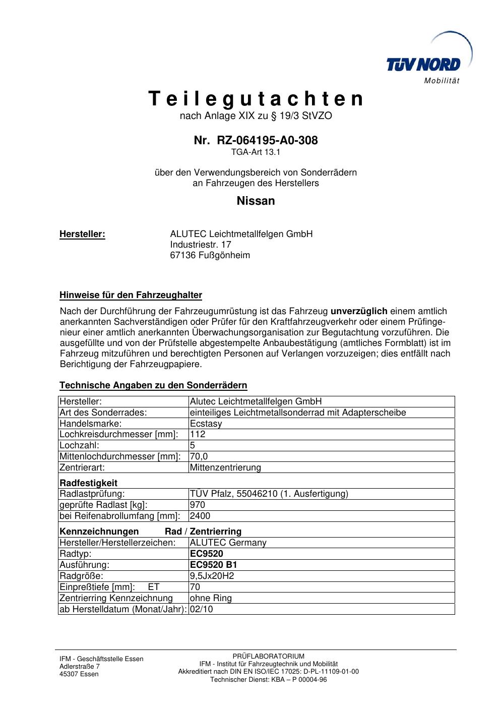 Dieses Gutachten (teilegutachten) bezieht sich auf die Alufelge ALUTEC EC9520 in der Ausführung 9.5Jx2 ET 0, Mittenloch 0 mm . Im PDF findest du typischerweise zulässige Reifengrößen, Auflagen/Anbauhinweise und – je nach Dokument – Hinweise zur Eintragung.