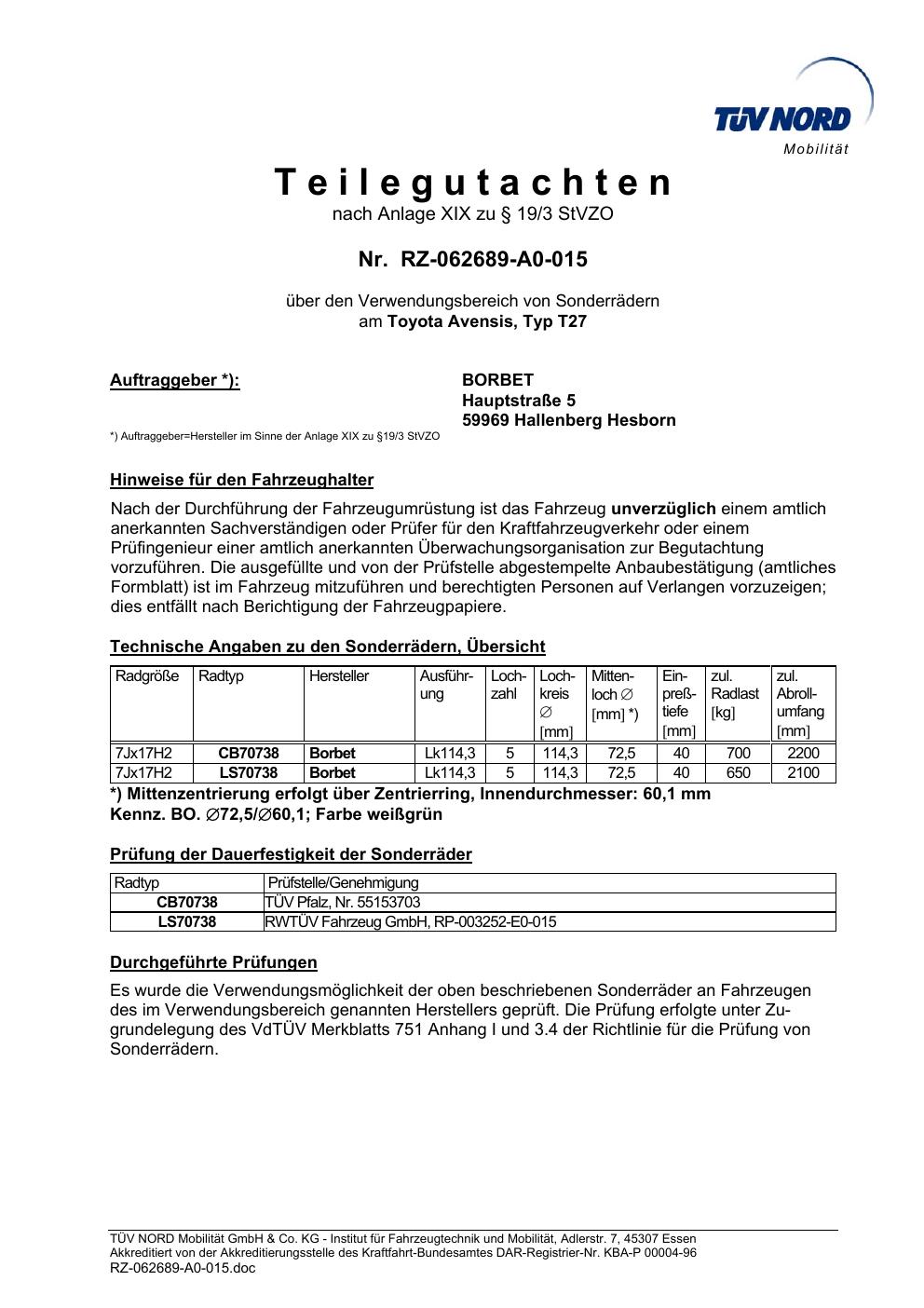 Dieses Gutachten (teilegutachten) bezieht sich auf die Alufelge ATS T27 in der Ausführung 7Jx17 ET 0, Mittenloch 0 mm . Im PDF findest du typischerweise zulässige Reifengrößen, Auflagen/Anbauhinweise und – je nach Dokument – Hinweise zur Eintragung.