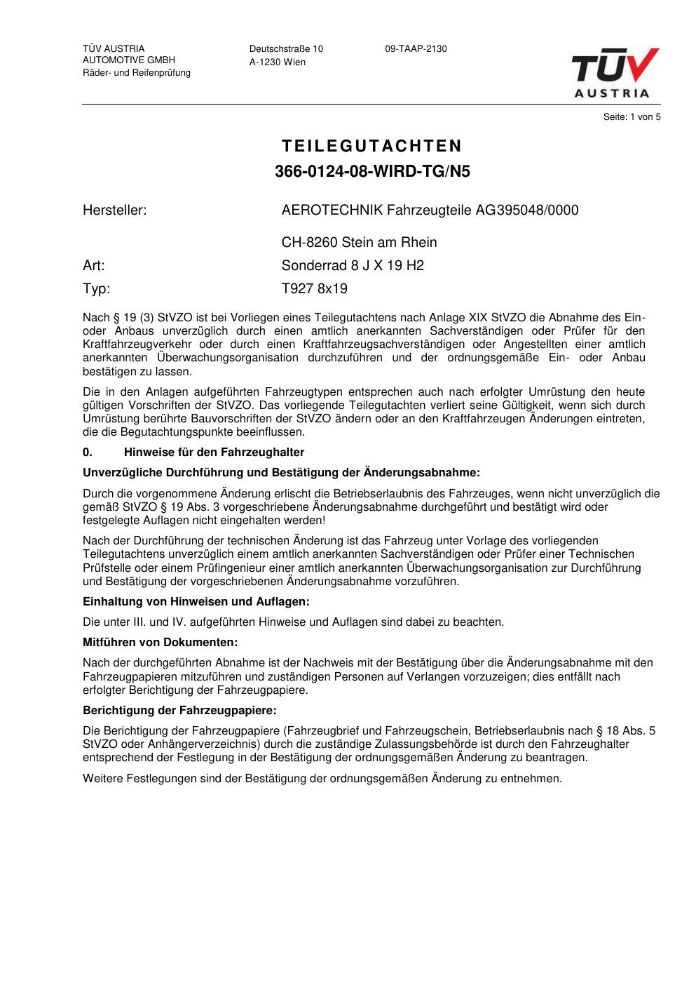 Dieses Gutachten (teilegutachten) bezieht sich auf die Alufelge ATS T927 8x19 in der Ausführung 8Jx19 ET 0, Mittenloch 0 mm . Im PDF findest du typischerweise zulässige Reifengrößen, Auflagen/Anbauhinweise und – je nach Dokument – Hinweise zur Eintragung.