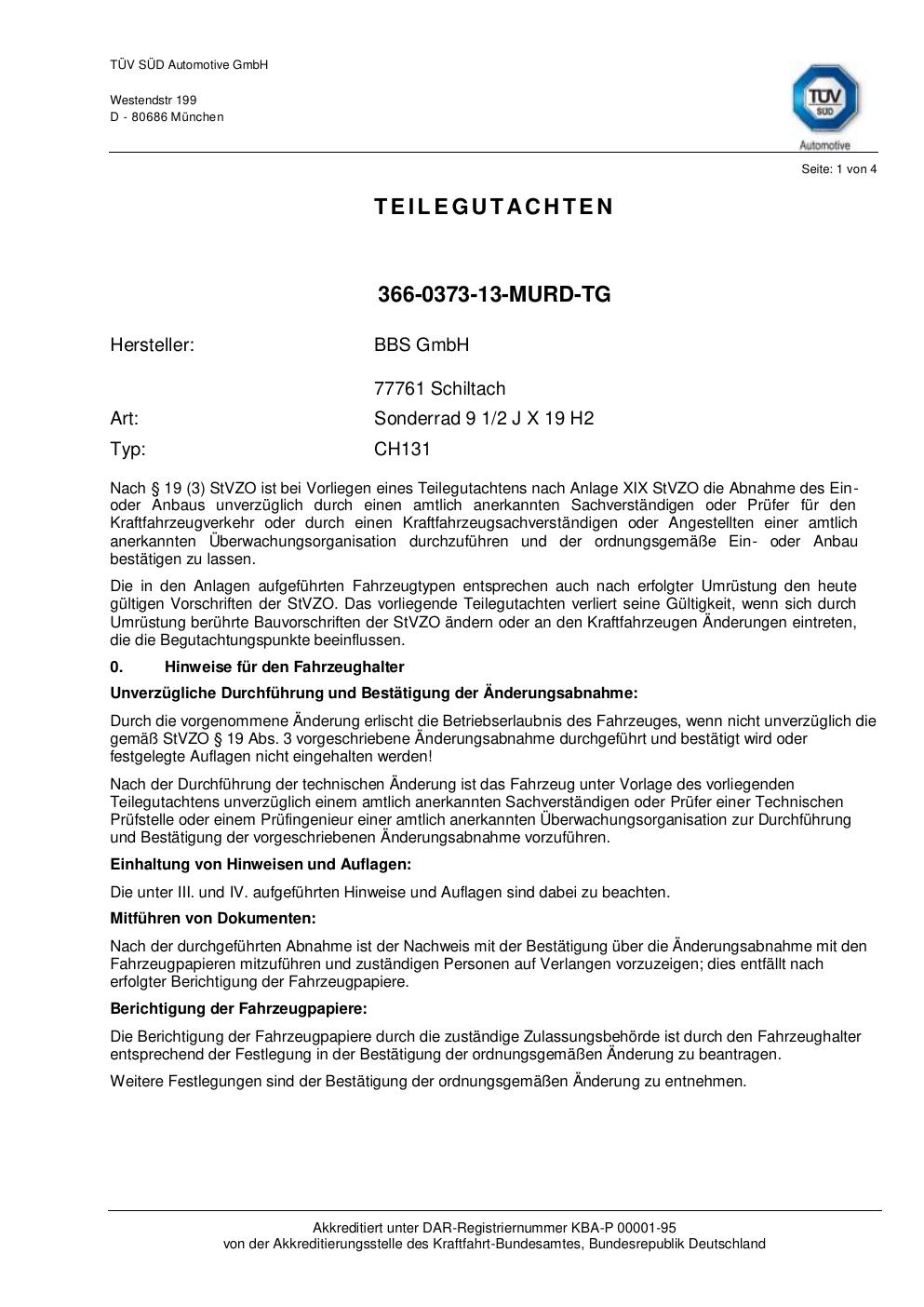 Dieses Gutachten (teilegutachten) bezieht sich auf die Alufelge BBS CH131 in der Ausführung 2Jx19 ET 0, Mittenloch 0 mm . Im PDF findest du typischerweise zulässige Reifengrößen, Auflagen/Anbauhinweise und – je nach Dokument – Hinweise zur Eintragung.