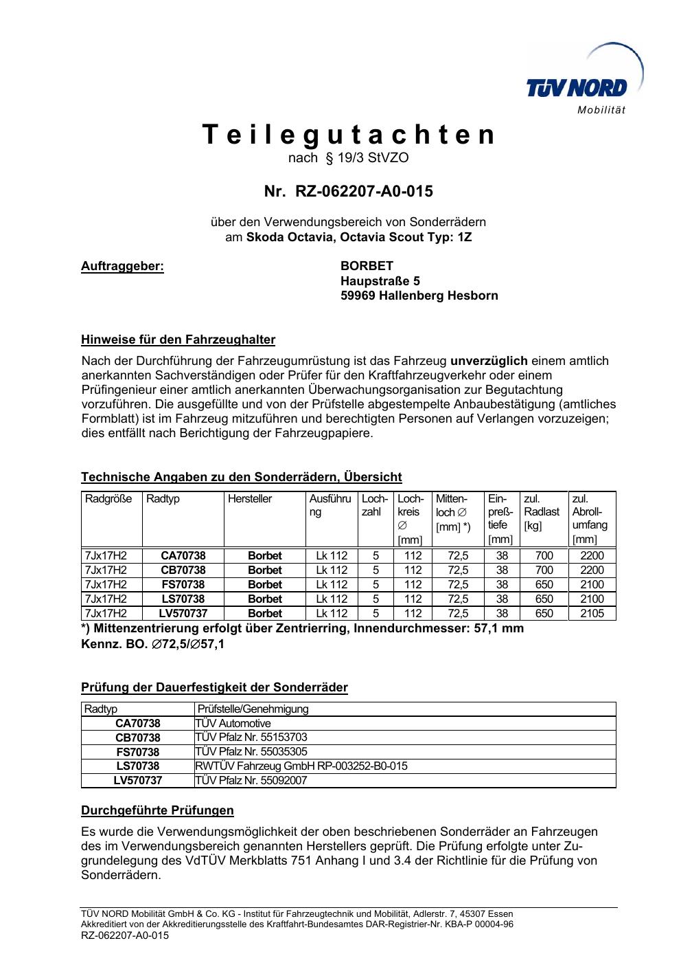 Dieses Gutachten (teilegutachten) bezieht sich auf die Alufelge Borbet 1Z in der Ausführung 7Jx17 ET 0, Mittenloch 0 mm . Im PDF findest du typischerweise zulässige Reifengrößen, Auflagen/Anbauhinweise und – je nach Dokument – Hinweise zur Eintragung.