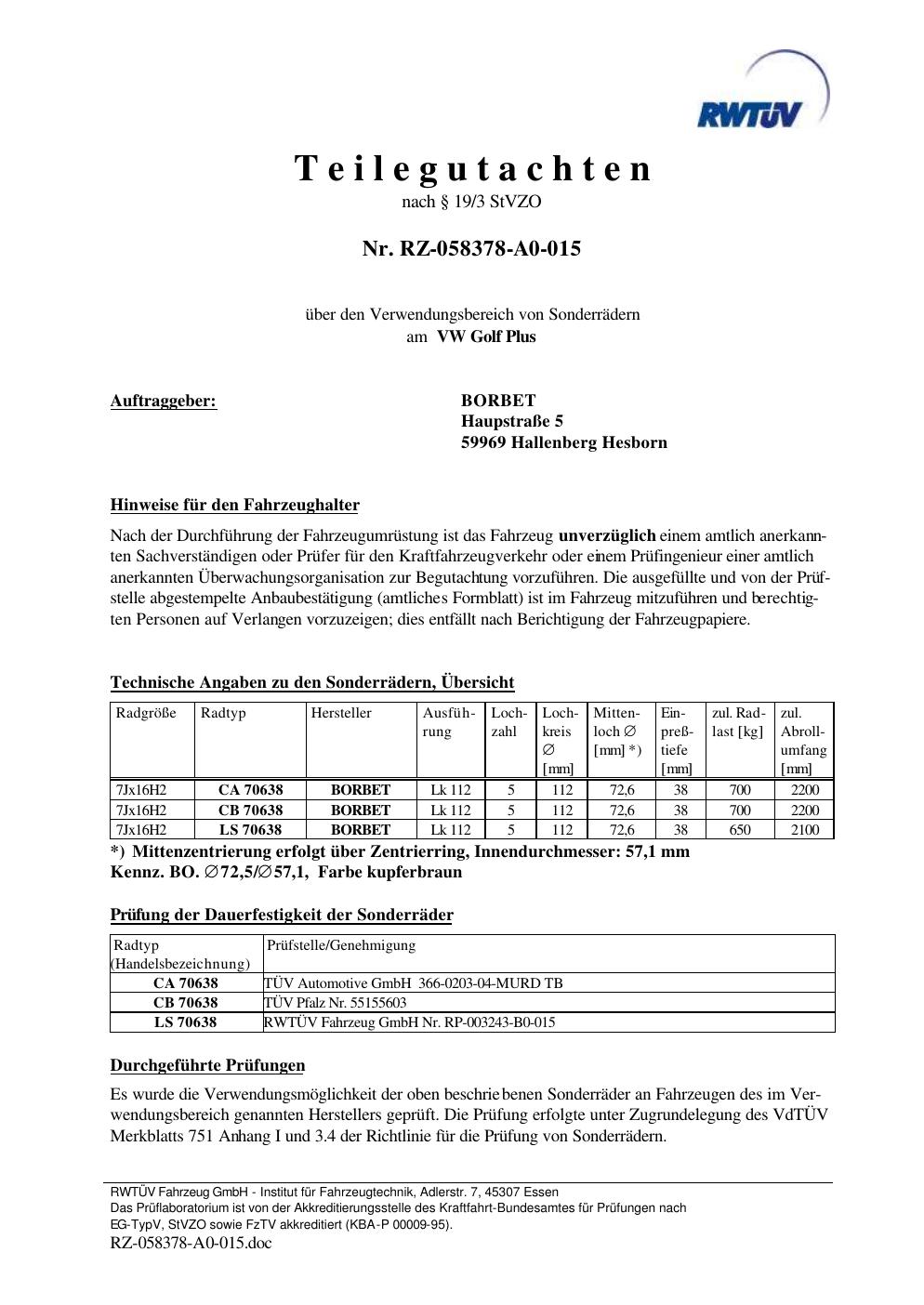 Dieses Gutachten (teilegutachten) bezieht sich auf die Alufelge Borbet TS85930 in der Ausführung 7Jx16 ET 0, Mittenloch 0 mm . Im PDF findest du typischerweise zulässige Reifengrößen, Auflagen/Anbauhinweise und – je nach Dokument – Hinweise zur Eintragung.