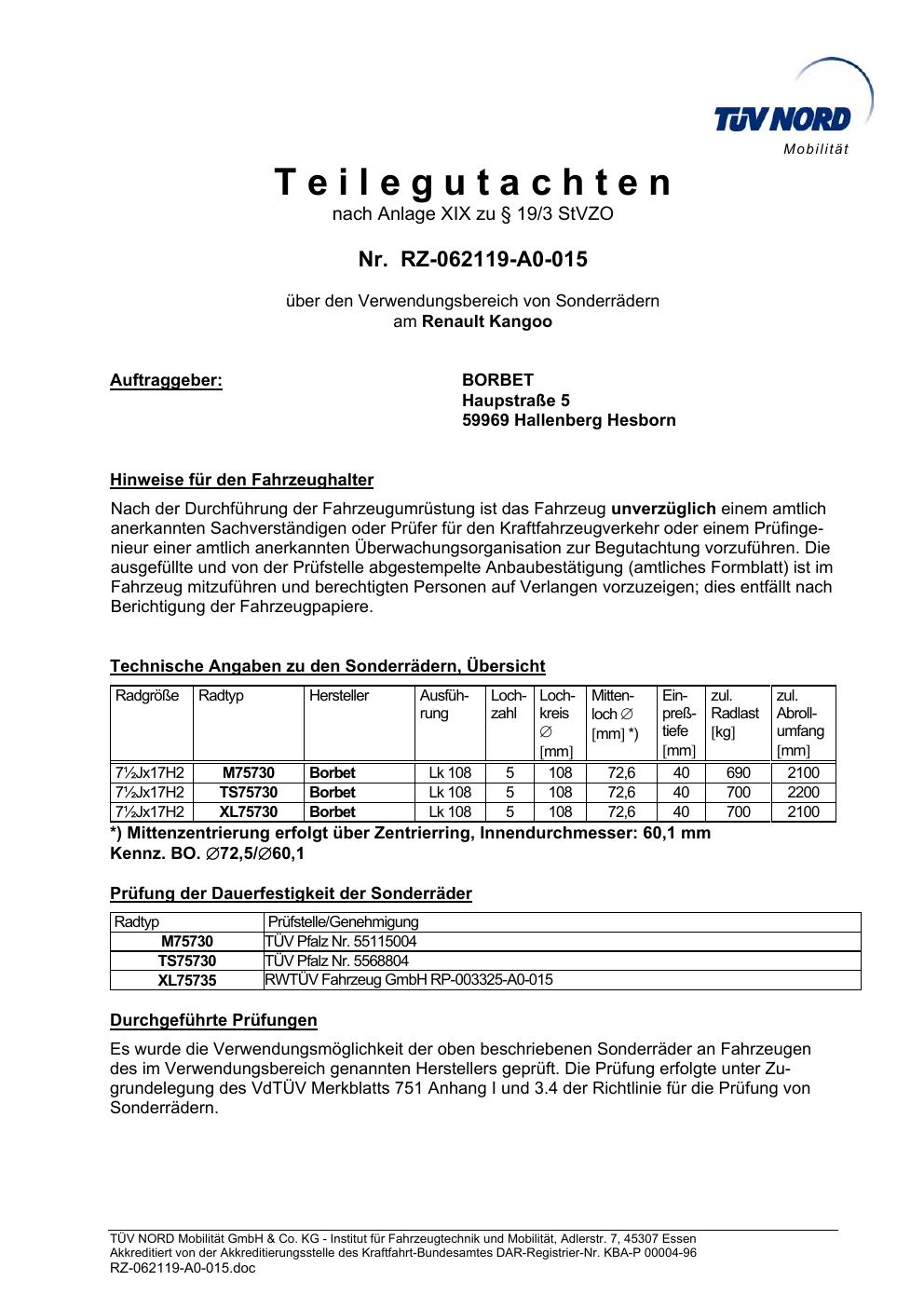 Dieses Gutachten (teilegutachten) bezieht sich auf die Alufelge Borbet TS85930 in der Ausführung ET 0, Mittenloch 0 mm . Im PDF findest du typischerweise zulässige Reifengrößen, Auflagen/Anbauhinweise und – je nach Dokument – Hinweise zur Eintragung.