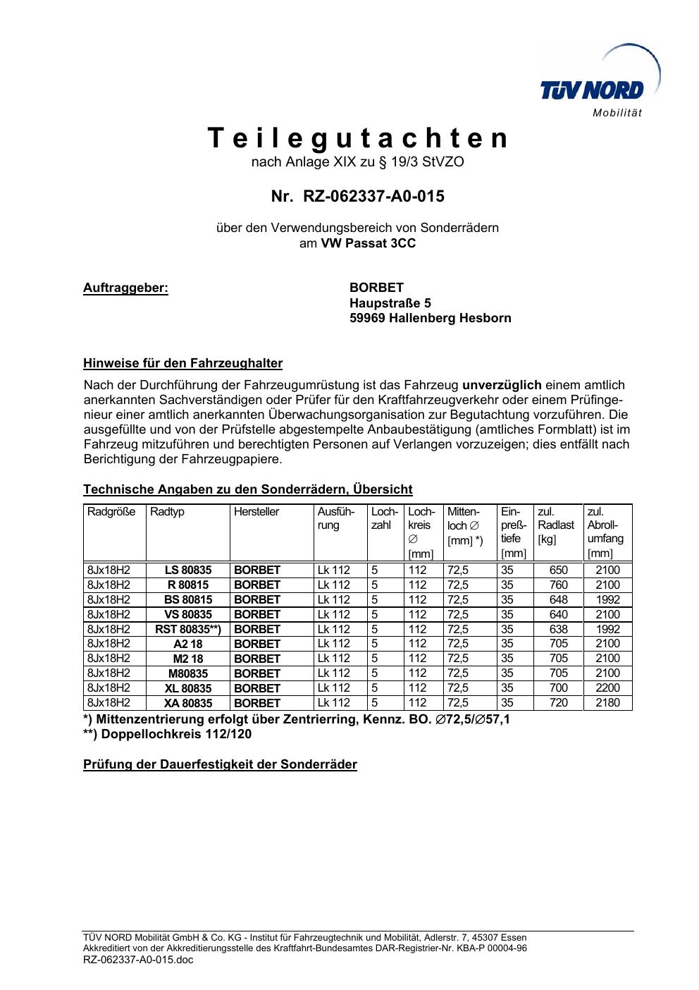 Dieses Gutachten (teilegutachten) bezieht sich auf die Alufelge Borbet TS85930 in der Ausführung 8Jx18 ET 0, Mittenloch 0 mm . Im PDF findest du typischerweise zulässige Reifengrößen, Auflagen/Anbauhinweise und – je nach Dokument – Hinweise zur Eintragung.