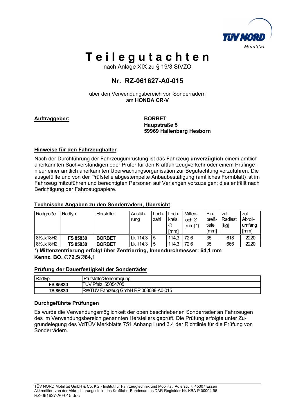 Felgengutachten / teilegutachten für Alufelgen Borbet TS85930 (ET 0, Mittenloch 0 mm) (Zertifikatsnummer igung). Hier kostenlos als PDF herunterladen. Der Download-Link ist 24 Stunden gültig und kann bis zu zwei Mal verwendet werden.
