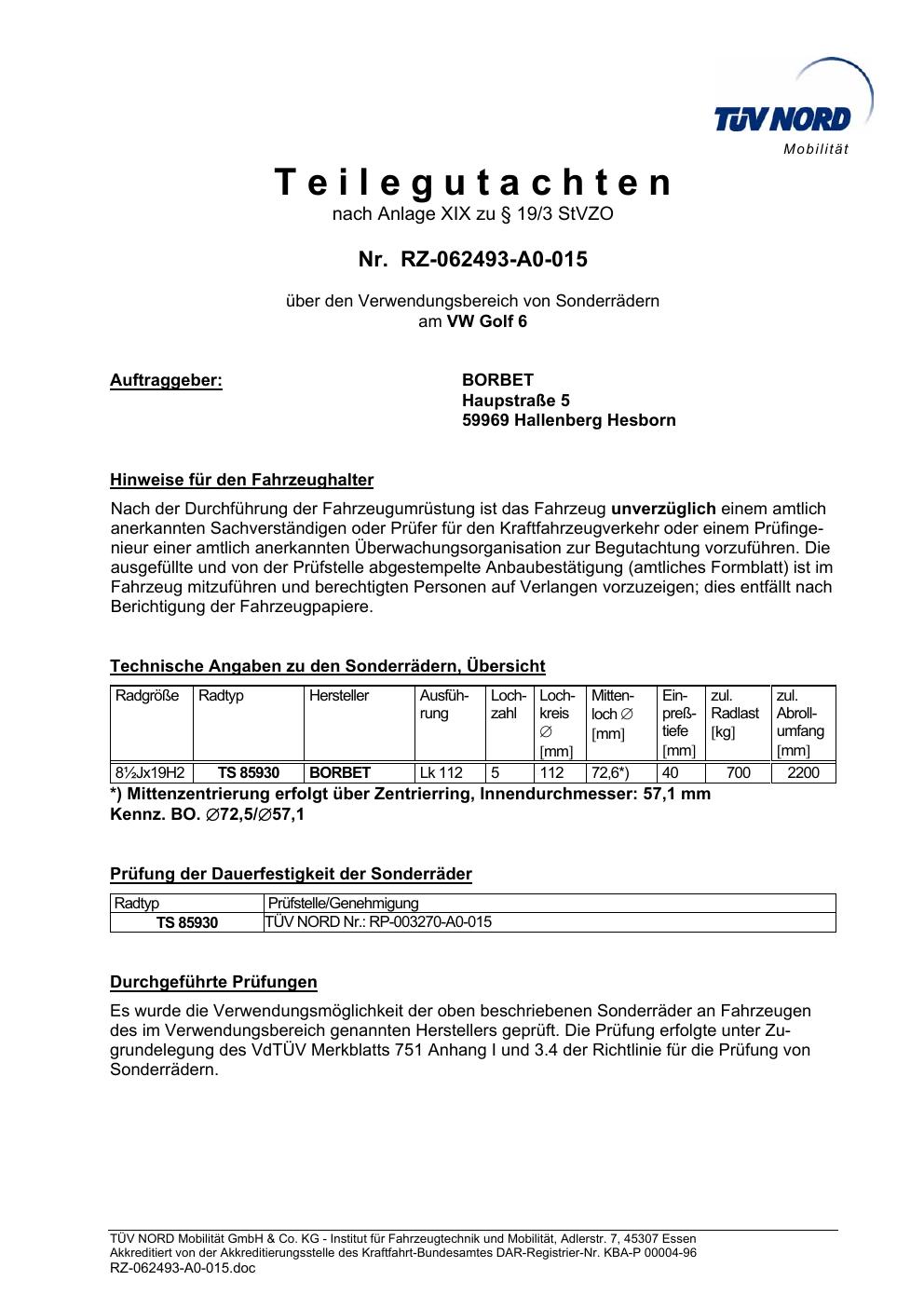 Felgengutachten / teilegutachten für Alufelgen Borbet TS85930 (ET 0, Mittenloch 0 mm) (Zertifikatsnummer igung). Hier kostenlos als PDF herunterladen. Der Download-Link ist 24 Stunden gültig und kann bis zu zwei Mal verwendet werden.