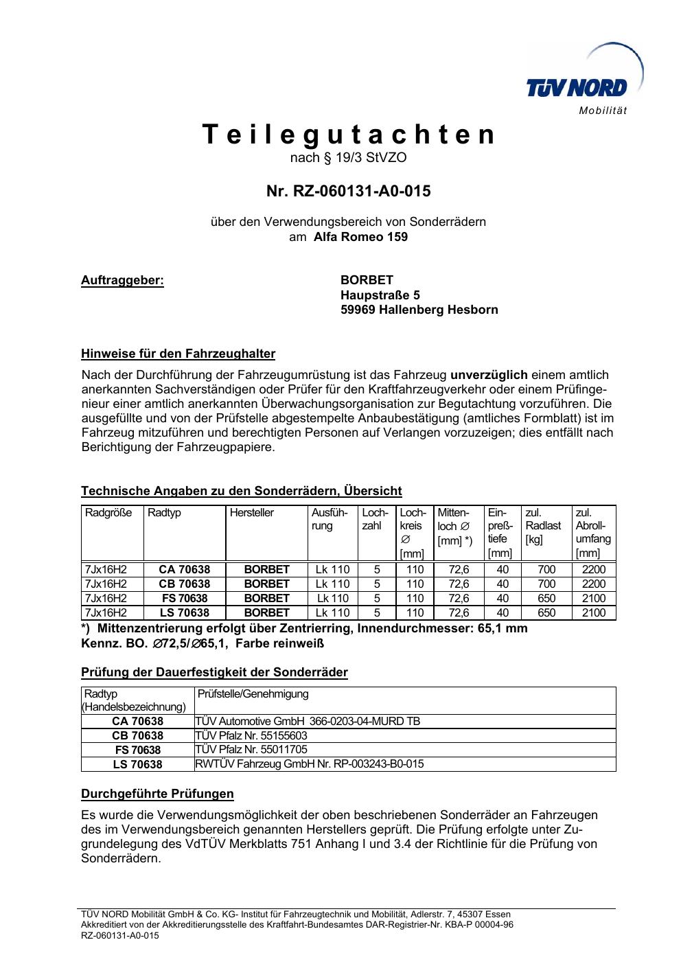 Dieses Gutachten (teilegutachten) bezieht sich auf die Alufelge Borbet TS85930 in der Ausführung 7Jx16 ET 0, Mittenloch 0 mm . Im PDF findest du typischerweise zulässige Reifengrößen, Auflagen/Anbauhinweise und – je nach Dokument – Hinweise zur Eintragung.