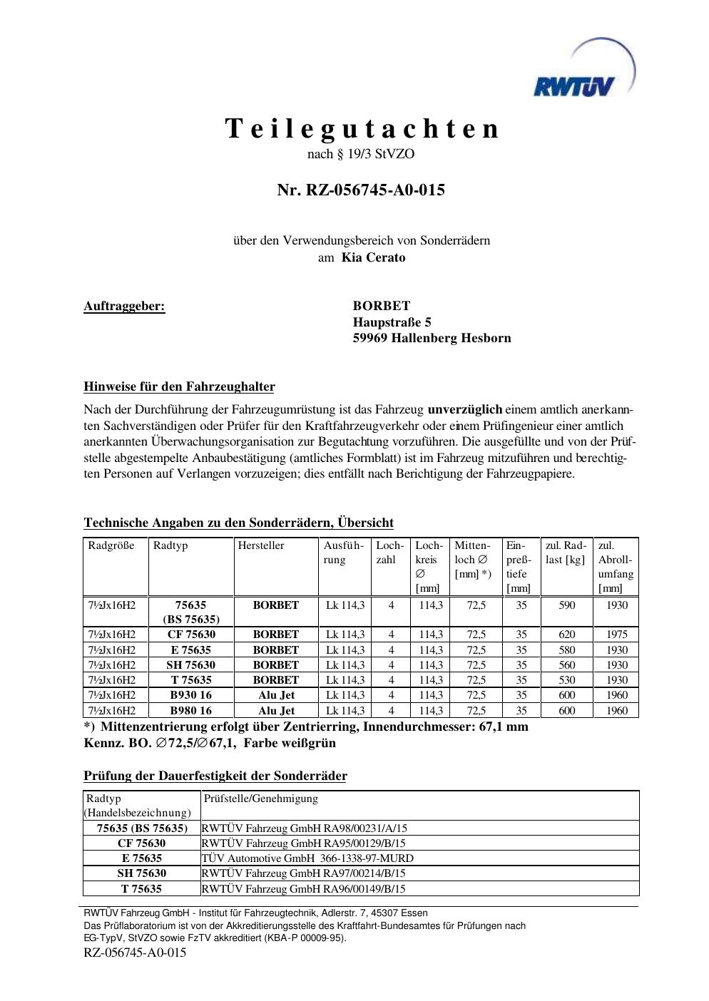 Felgengutachten / teilegutachten für Alufelgen Borbet TS85930 (ET 0, Mittenloch 0 mm) (Zertifikatsnummer igung). Hier kostenlos als PDF herunterladen. Der Download-Link ist 24 Stunden gültig und kann bis zu zwei Mal verwendet werden.