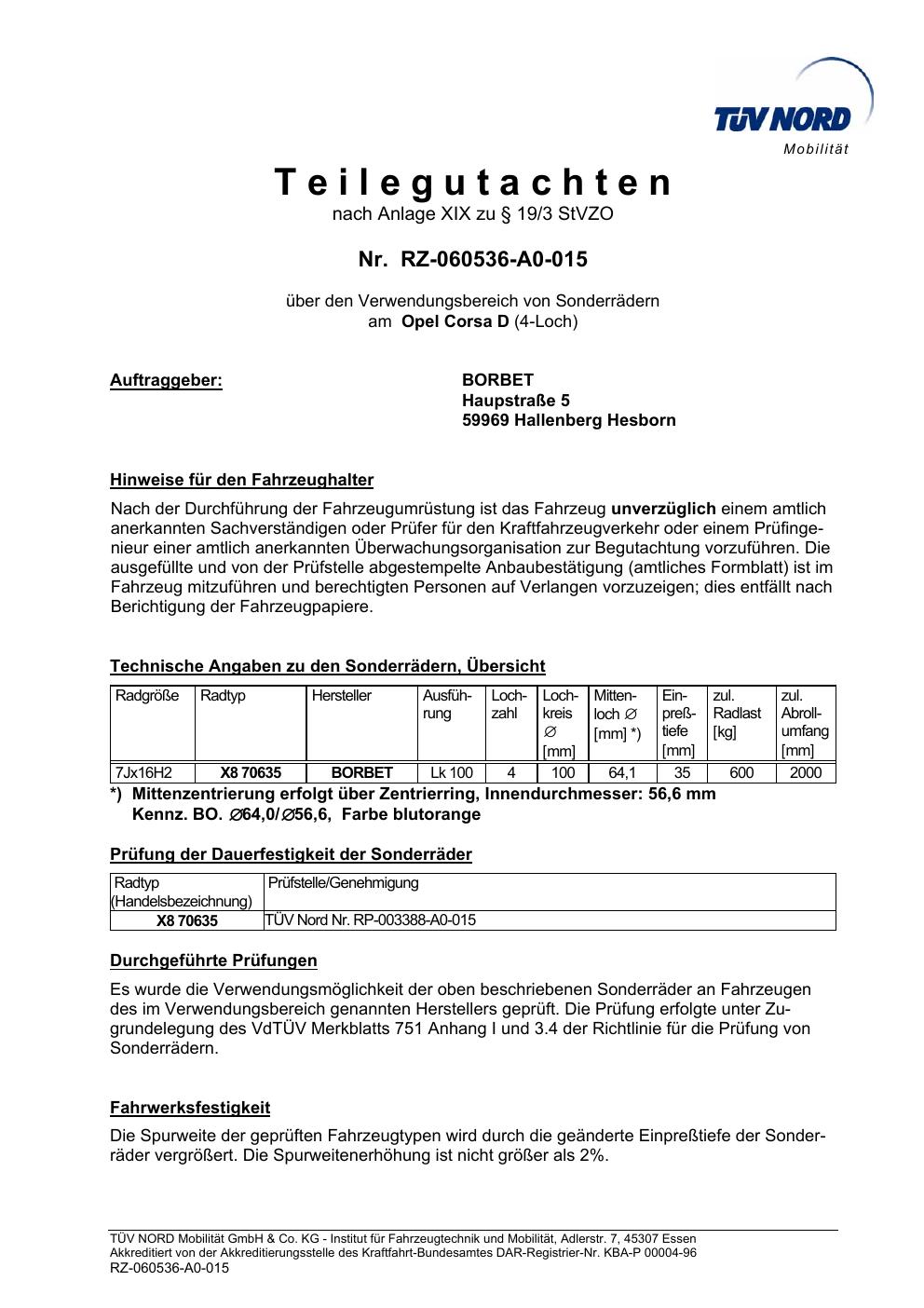 Dieses Gutachten (teilegutachten) bezieht sich auf die Alufelge Borbet TS85930 in der Ausführung 7Jx16 ET 0, Mittenloch 0 mm . Im PDF findest du typischerweise zulässige Reifengrößen, Auflagen/Anbauhinweise und – je nach Dokument – Hinweise zur Eintragung.