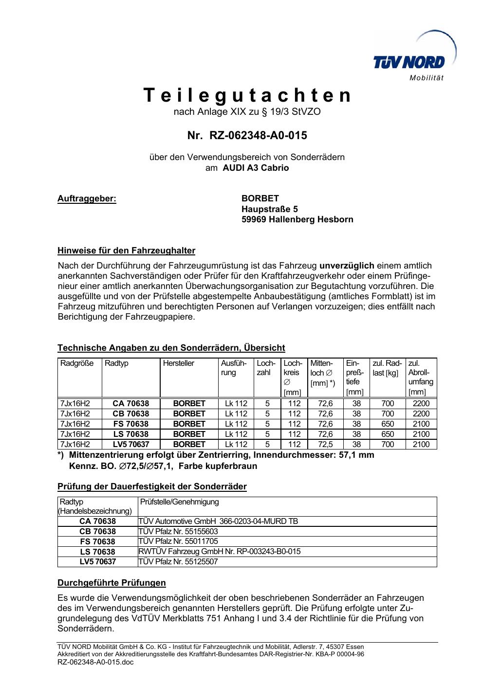 Dieses Gutachten (teilegutachten) bezieht sich auf die Alufelge Borbet TS85930 in der Ausführung 7Jx16 ET 0, Mittenloch 0 mm . Im PDF findest du typischerweise zulässige Reifengrößen, Auflagen/Anbauhinweise und – je nach Dokument – Hinweise zur Eintragung.