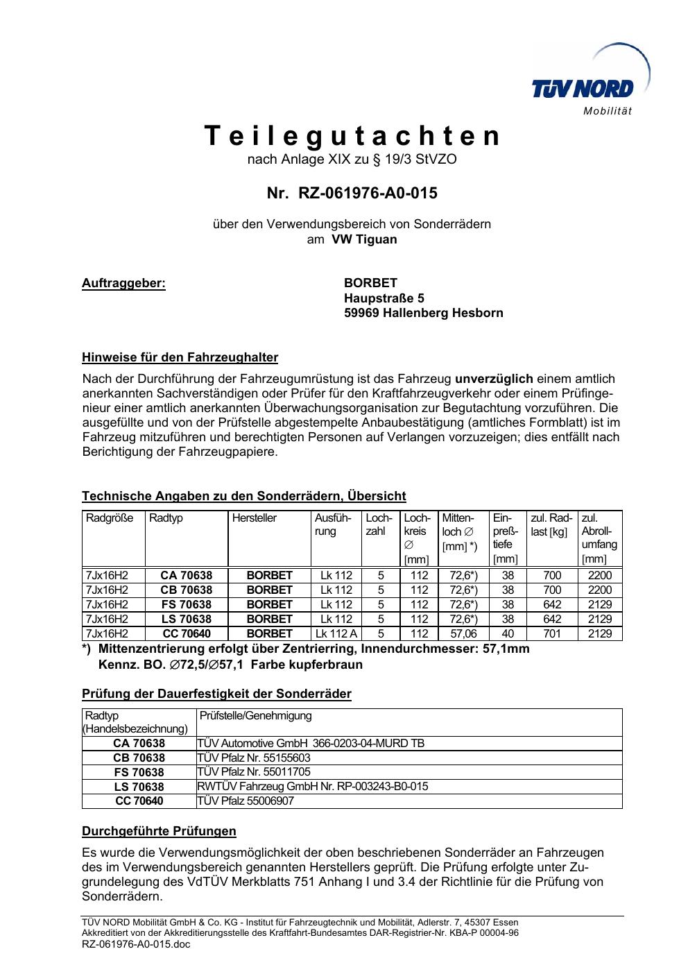 Dieses Gutachten (teilegutachten) bezieht sich auf die Alufelge Borbet TS85930 in der Ausführung 7Jx16 ET 0, Mittenloch 0 mm . Im PDF findest du typischerweise zulässige Reifengrößen, Auflagen/Anbauhinweise und – je nach Dokument – Hinweise zur Eintragung.