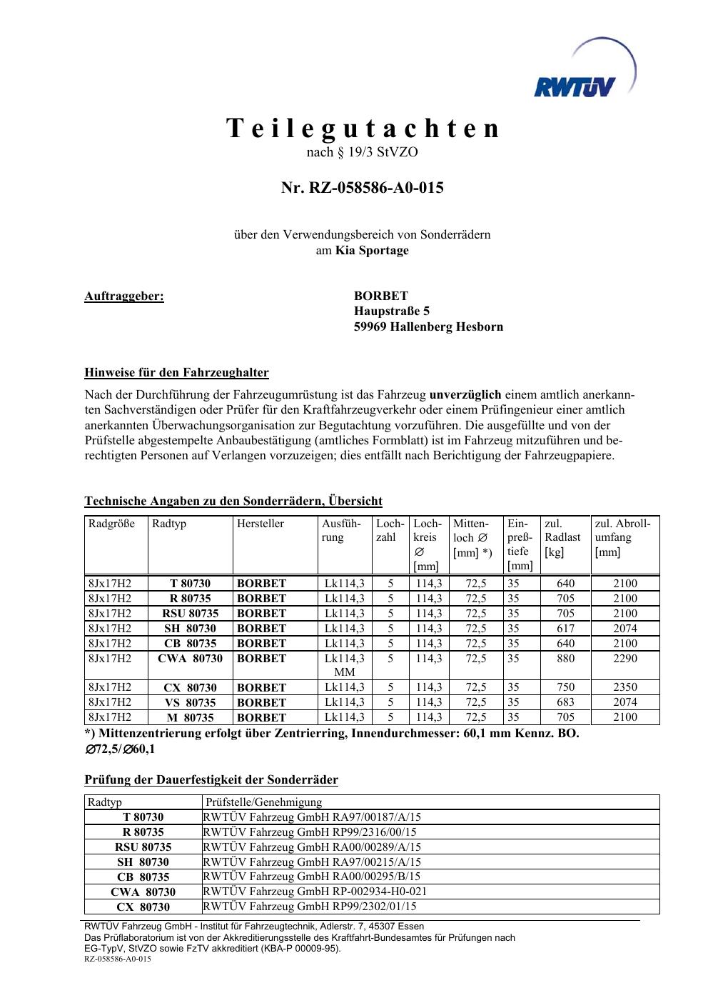 Dieses Gutachten (teilegutachten) bezieht sich auf die Alufelge Borbet TS85930 in der Ausführung 8Jx17 ET 0, Mittenloch 0 mm . Im PDF findest du typischerweise zulässige Reifengrößen, Auflagen/Anbauhinweise und – je nach Dokument – Hinweise zur Eintragung.