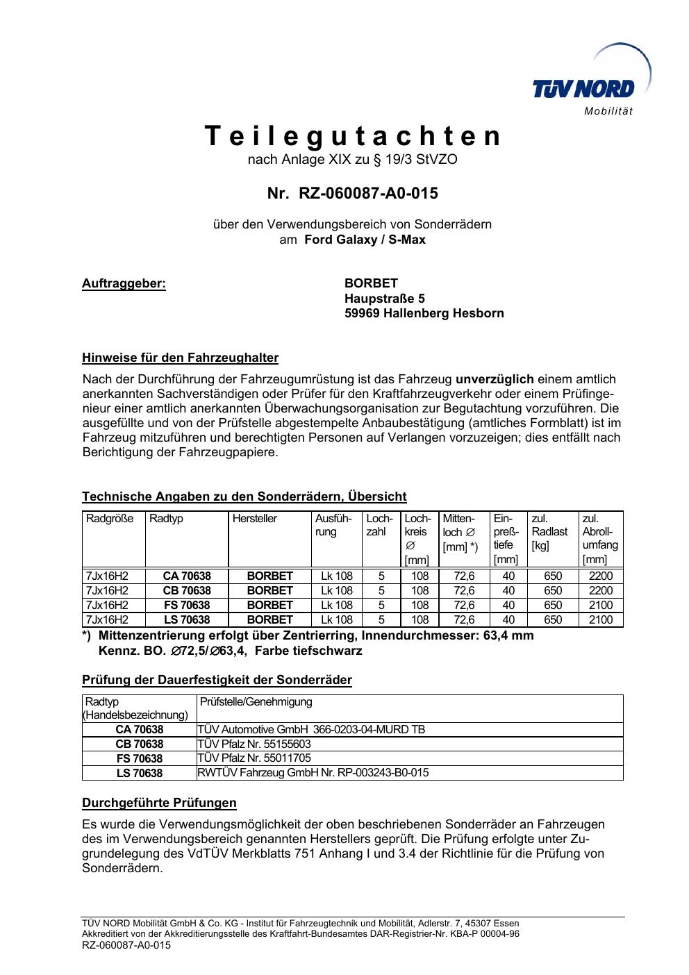 Dieses Gutachten (teilegutachten) bezieht sich auf die Alufelge Borbet TS85930 in der Ausführung 7Jx16 ET 0, Mittenloch 0 mm . Im PDF findest du typischerweise zulässige Reifengrößen, Auflagen/Anbauhinweise und – je nach Dokument – Hinweise zur Eintragung.