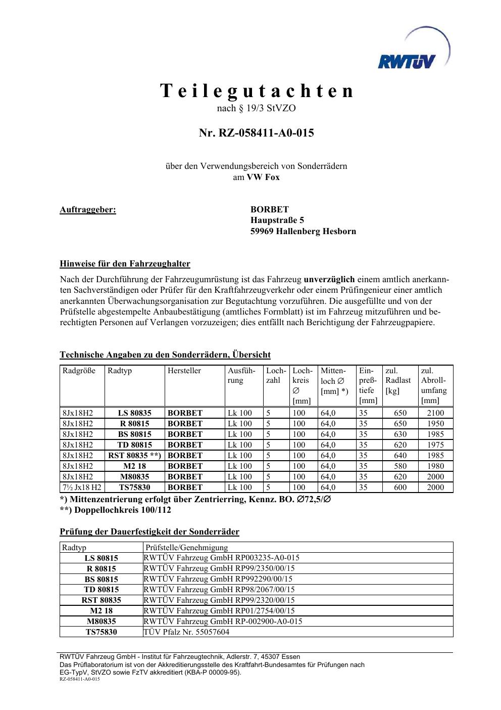 Dieses Gutachten (teilegutachten) bezieht sich auf die Alufelge Borbet TS85930 in der Ausführung 8Jx18 ET 0, Mittenloch 0 mm . Im PDF findest du typischerweise zulässige Reifengrößen, Auflagen/Anbauhinweise und – je nach Dokument – Hinweise zur Eintragung.