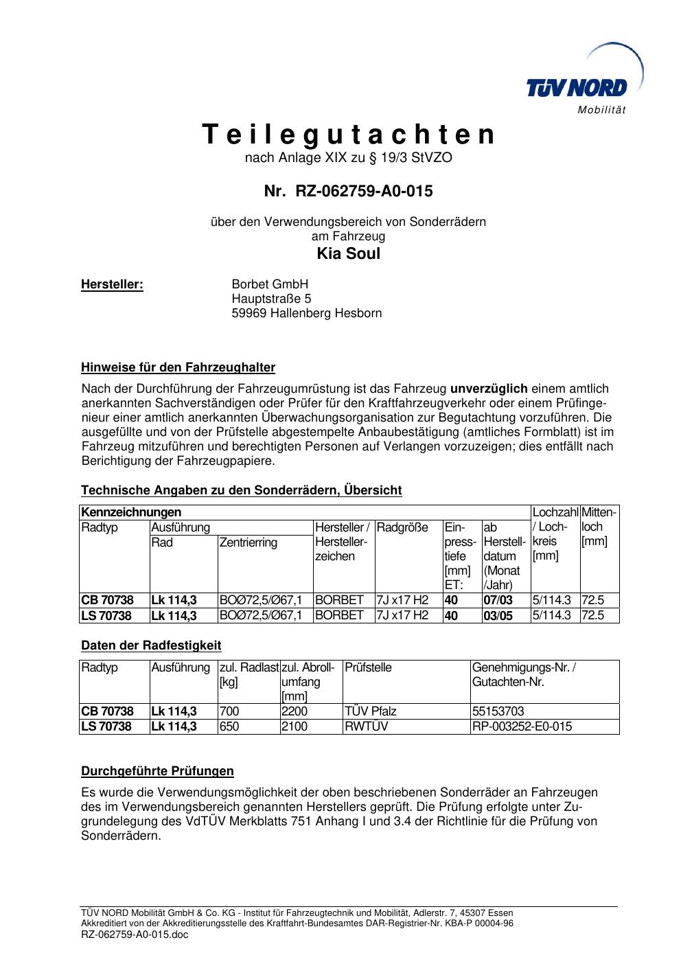 Dieses Gutachten (teilegutachten) bezieht sich auf die Alufelge Borbet LS 70638 in der Ausführung 7Jx17 ET 0, Mittenloch 0 mm . Im PDF findest du typischerweise zulässige Reifengrößen, Auflagen/Anbauhinweise und – je nach Dokument – Hinweise zur Eintragung.