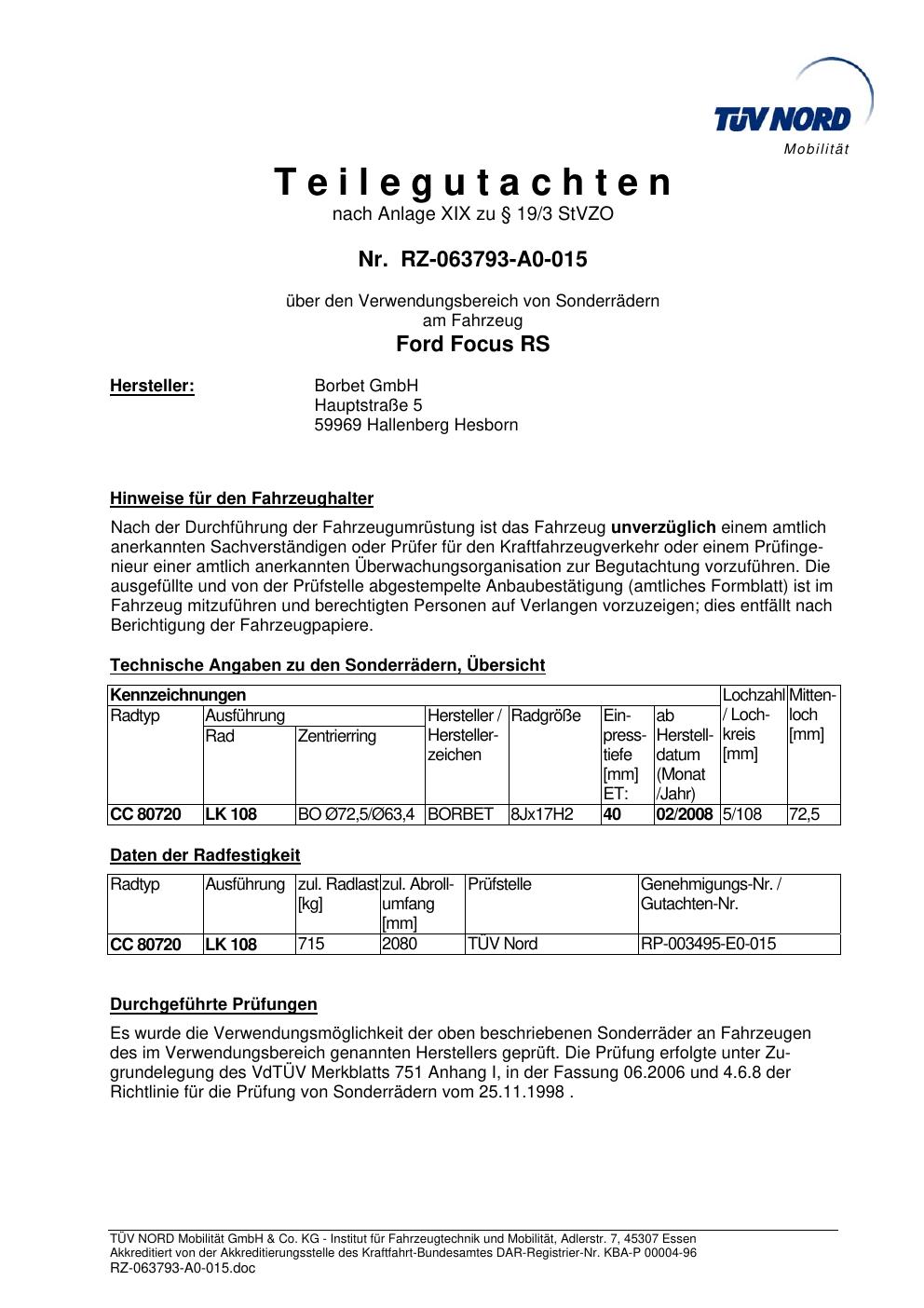 Dieses Gutachten (teilegutachten) bezieht sich auf die Alufelge Borbet LS 70638 in der Ausführung 8Jx17 ET 0, Mittenloch 0 mm . Im PDF findest du typischerweise zulässige Reifengrößen, Auflagen/Anbauhinweise und – je nach Dokument – Hinweise zur Eintragung.