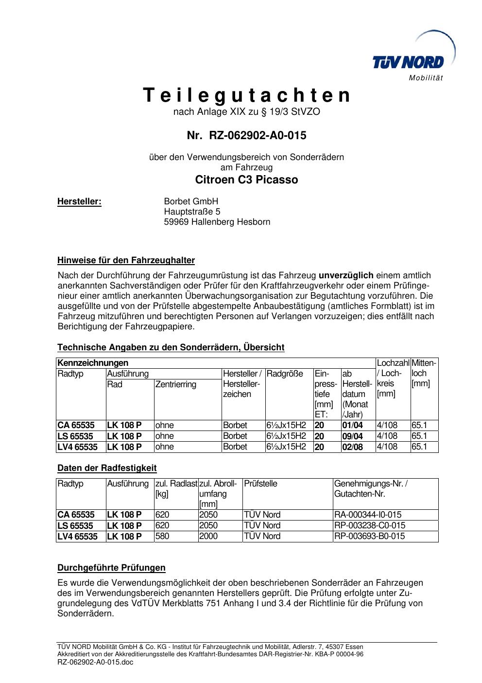 Dieses Gutachten (teilegutachten) bezieht sich auf die Alufelge Borbet LS 70638 in der Ausführung ET 0, Mittenloch 0 mm . Im PDF findest du typischerweise zulässige Reifengrößen, Auflagen/Anbauhinweise und – je nach Dokument – Hinweise zur Eintragung.