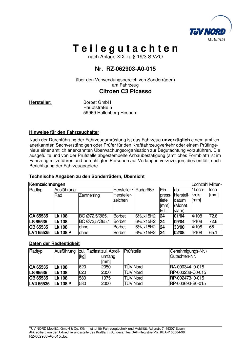 Dieses Gutachten (teilegutachten) bezieht sich auf die Alufelge Borbet LS 70638 in der Ausführung ET 0, Mittenloch 0 mm . Im PDF findest du typischerweise zulässige Reifengrößen, Auflagen/Anbauhinweise und – je nach Dokument – Hinweise zur Eintragung.