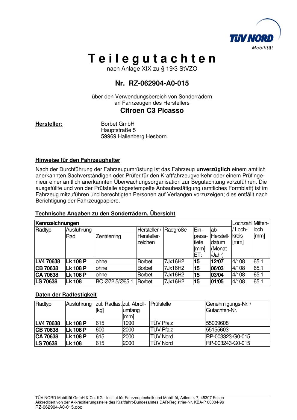 Dieses Gutachten (teilegutachten) bezieht sich auf die Alufelge Borbet LS 70638 in der Ausführung 7Jx16 ET 0, Mittenloch 0 mm . Im PDF findest du typischerweise zulässige Reifengrößen, Auflagen/Anbauhinweise und – je nach Dokument – Hinweise zur Eintragung.