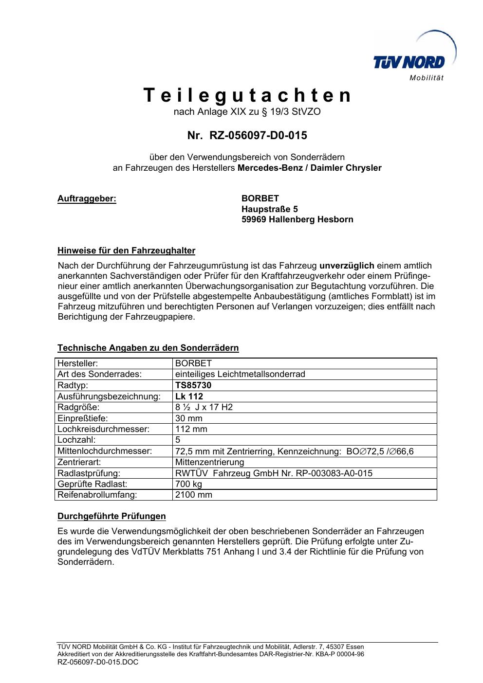 Dieses Gutachten (teilegutachten) bezieht sich auf die Alufelge Borbet TS85730 in der Ausführung ET 0, Mittenloch 0 mm . Im PDF findest du typischerweise zulässige Reifengrößen, Auflagen/Anbauhinweise und – je nach Dokument – Hinweise zur Eintragung.