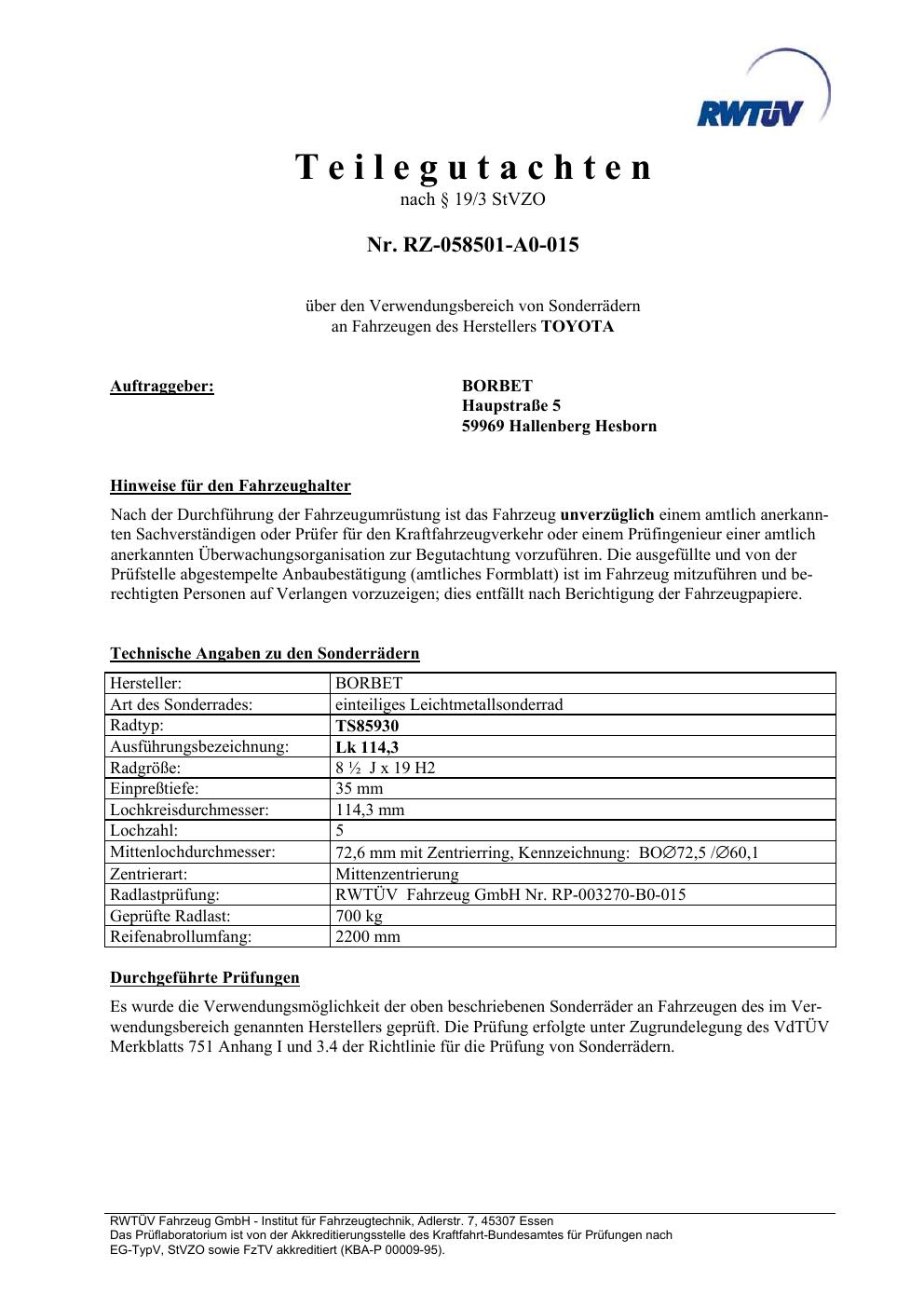 teilegutachten igung Borbet TS85930
