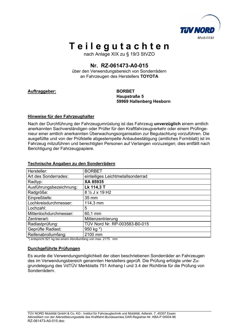 Dieses Gutachten (teilegutachten) bezieht sich auf die Alufelge Borbet XA 85935 in der Ausführung ET 0, Mittenloch 0 mm . Im PDF findest du typischerweise zulässige Reifengrößen, Auflagen/Anbauhinweise und – je nach Dokument – Hinweise zur Eintragung.