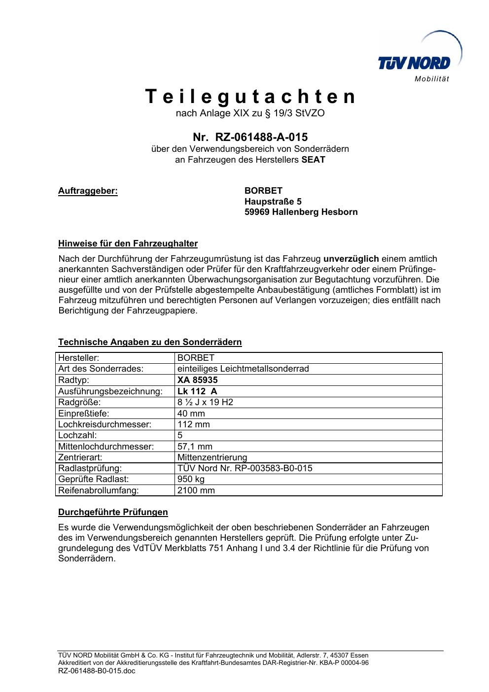 teilegutachten igung Borbet XA 85935
