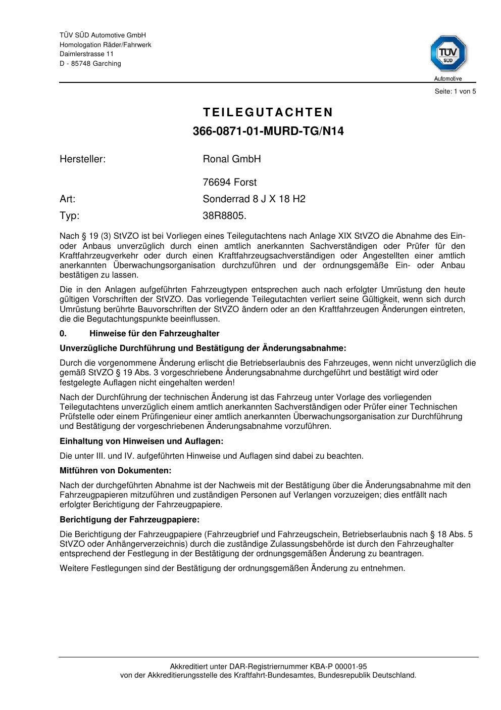 Dieses Gutachten (teilegutachten) bezieht sich auf die Alufelge Ronal 38R8805 in der Ausführung 8Jx18 ET 0, Mittenloch 0 mm . Im PDF findest du typischerweise zulässige Reifengrößen, Auflagen/Anbauhinweise und – je nach Dokument – Hinweise zur Eintragung.
