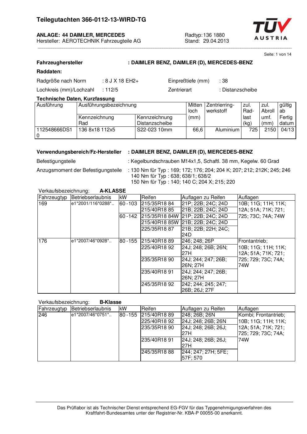 Dieses Gutachten (teilegutachten) bezieht sich auf die Alufelge ATS 136 1880 in der Ausführung 8Jx18 ET 0, Mittenloch 0 mm . Im PDF findest du typischerweise zulässige Reifengrößen, Auflagen/Anbauhinweise und – je nach Dokument – Hinweise zur Eintragung.