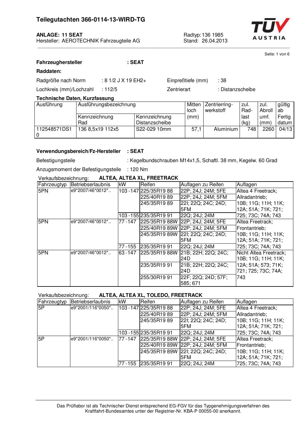 Dieses Gutachten (teilegutachten) bezieht sich auf die Alufelge ATS 136 1985 in der Ausführung 2Jx19 ET 0, Mittenloch 0 mm . Im PDF findest du typischerweise zulässige Reifengrößen, Auflagen/Anbauhinweise und – je nach Dokument – Hinweise zur Eintragung.