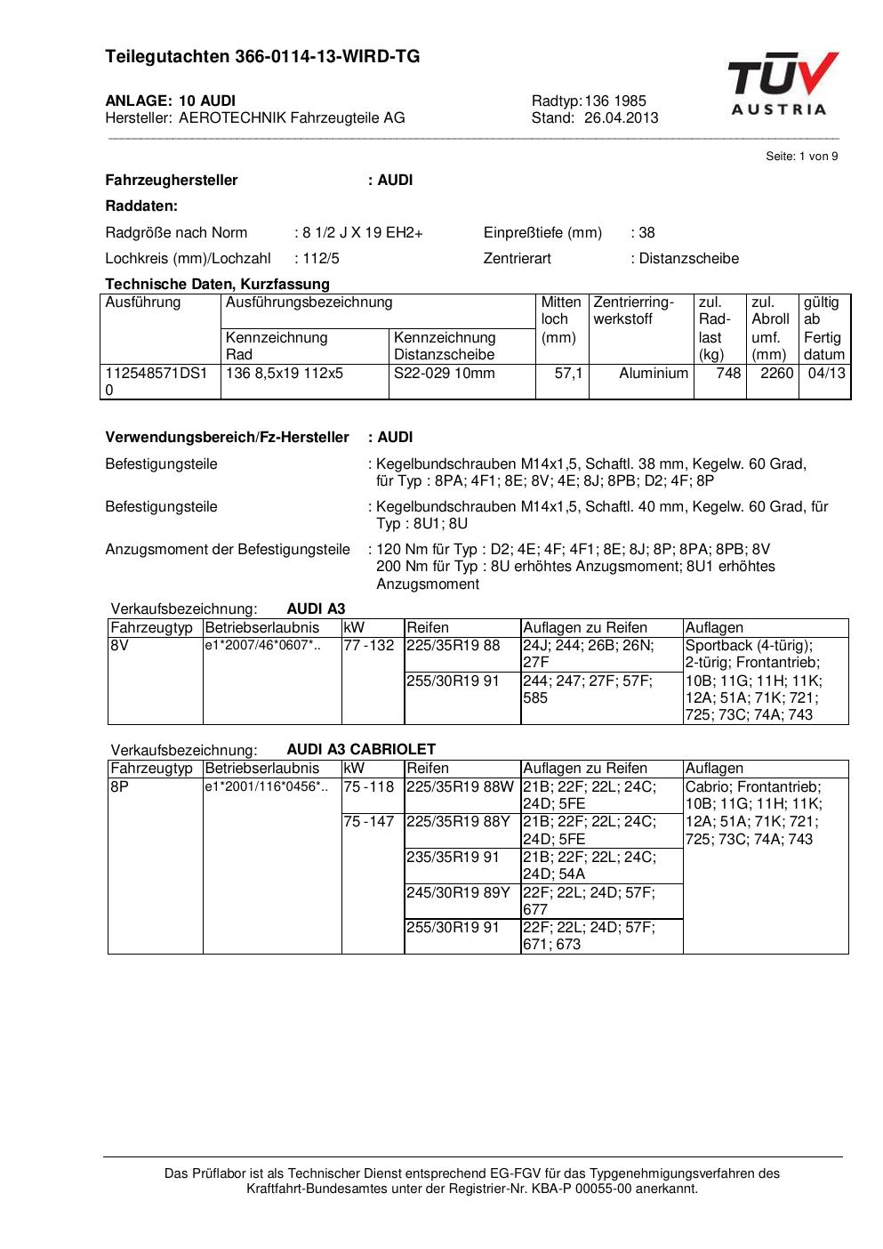 Dieses Gutachten (teilegutachten) bezieht sich auf die Alufelge ATS 136 1985 in der Ausführung 2Jx19 ET 0, Mittenloch 0 mm . Im PDF findest du typischerweise zulässige Reifengrößen, Auflagen/Anbauhinweise und – je nach Dokument – Hinweise zur Eintragung.