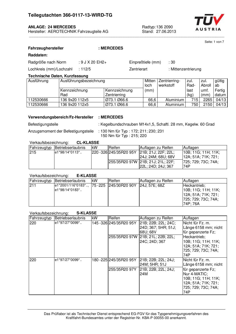 Dieses Gutachten (teilegutachten) bezieht sich auf die Alufelge ATS 136 2090 in der Ausführung 9Jx2 ET 0, Mittenloch 0 mm . Im PDF findest du typischerweise zulässige Reifengrößen, Auflagen/Anbauhinweise und – je nach Dokument – Hinweise zur Eintragung.