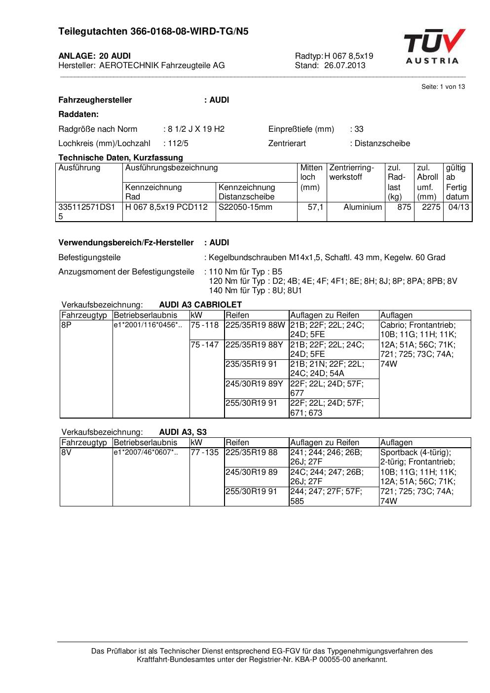 Dieses Gutachten (teilegutachten) bezieht sich auf die Alufelge ATS H 067 8 in der Ausführung 8.5Jx19 ET 0, Mittenloch 0 mm . Im PDF findest du typischerweise zulässige Reifengrößen, Auflagen/Anbauhinweise und – je nach Dokument – Hinweise zur Eintragung.