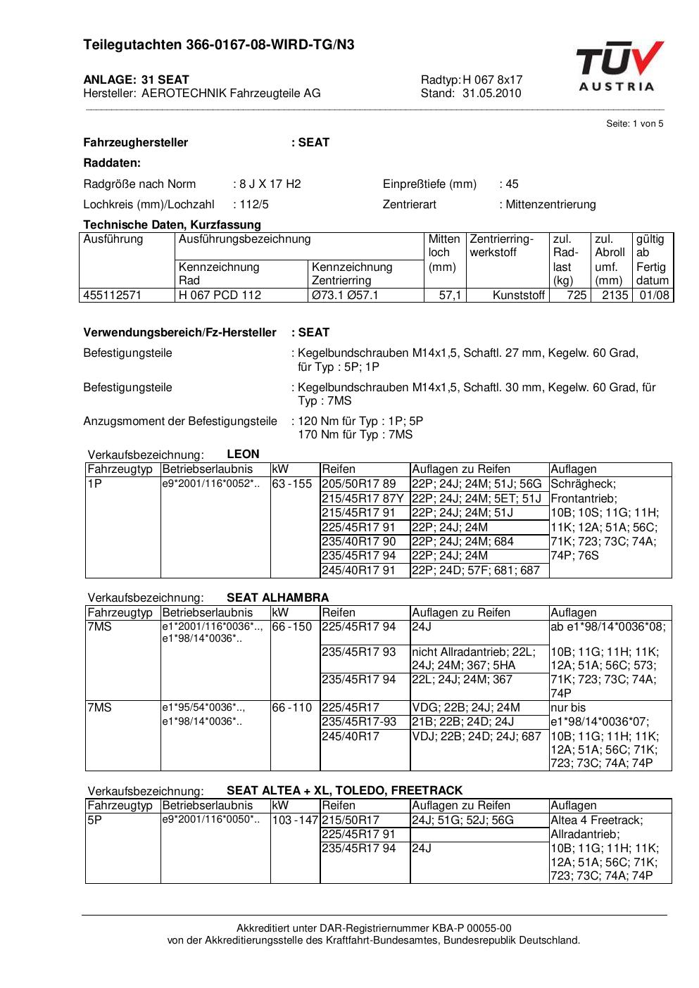 Dieses Gutachten (teilegutachten) bezieht sich auf die Alufelge ATS H 067 8x17 in der Ausführung 8Jx17 ET 0, Mittenloch 0 mm . Im PDF findest du typischerweise zulässige Reifengrößen, Auflagen/Anbauhinweise und – je nach Dokument – Hinweise zur Eintragung.