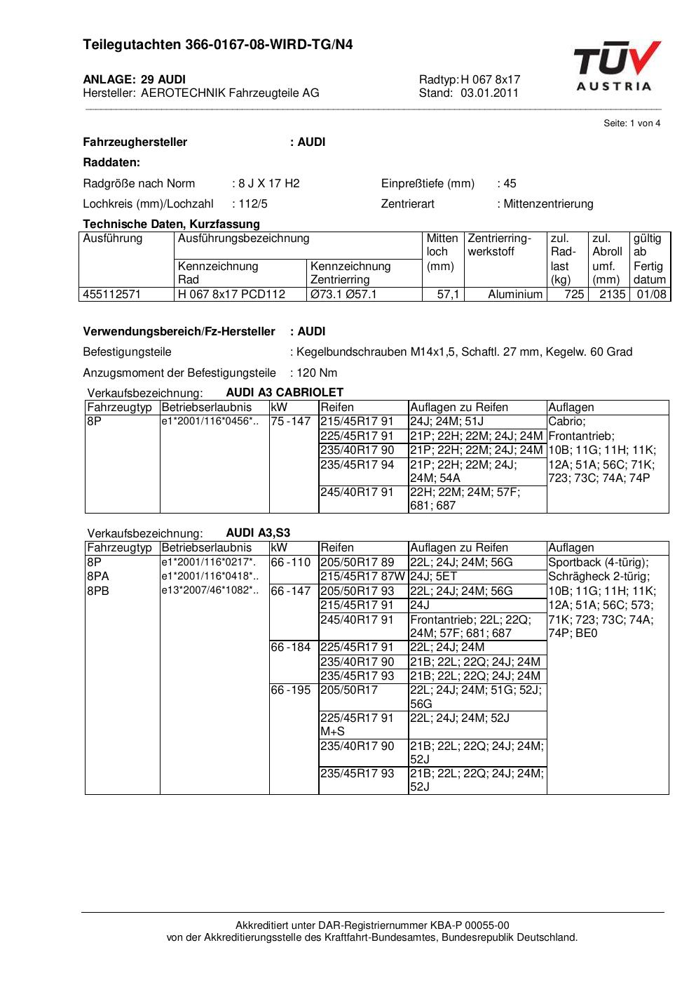 Dieses Gutachten (teilegutachten) bezieht sich auf die Alufelge ATS H 067 8x17 in der Ausführung 8Jx17 ET 0, Mittenloch 0 mm . Im PDF findest du typischerweise zulässige Reifengrößen, Auflagen/Anbauhinweise und – je nach Dokument – Hinweise zur Eintragung.