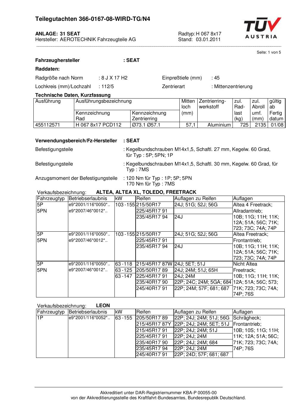 Dieses Gutachten (teilegutachten) bezieht sich auf die Alufelge ATS H 067 8x17 in der Ausführung 8Jx17 ET 0, Mittenloch 0 mm . Im PDF findest du typischerweise zulässige Reifengrößen, Auflagen/Anbauhinweise und – je nach Dokument – Hinweise zur Eintragung.
