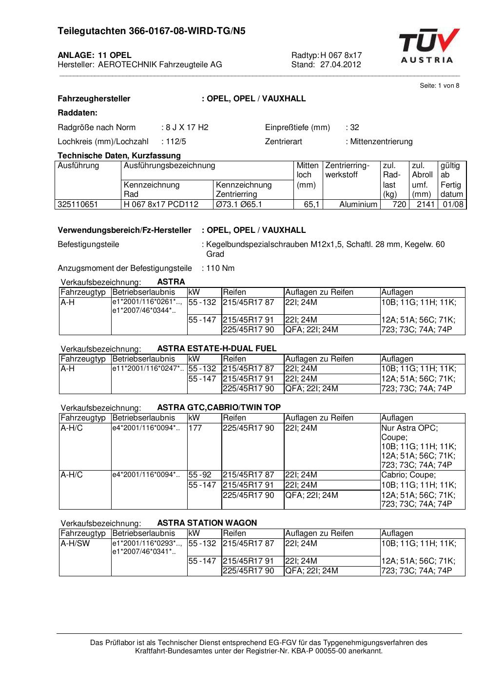 teilegutachten nicht ATS H 067 8x17