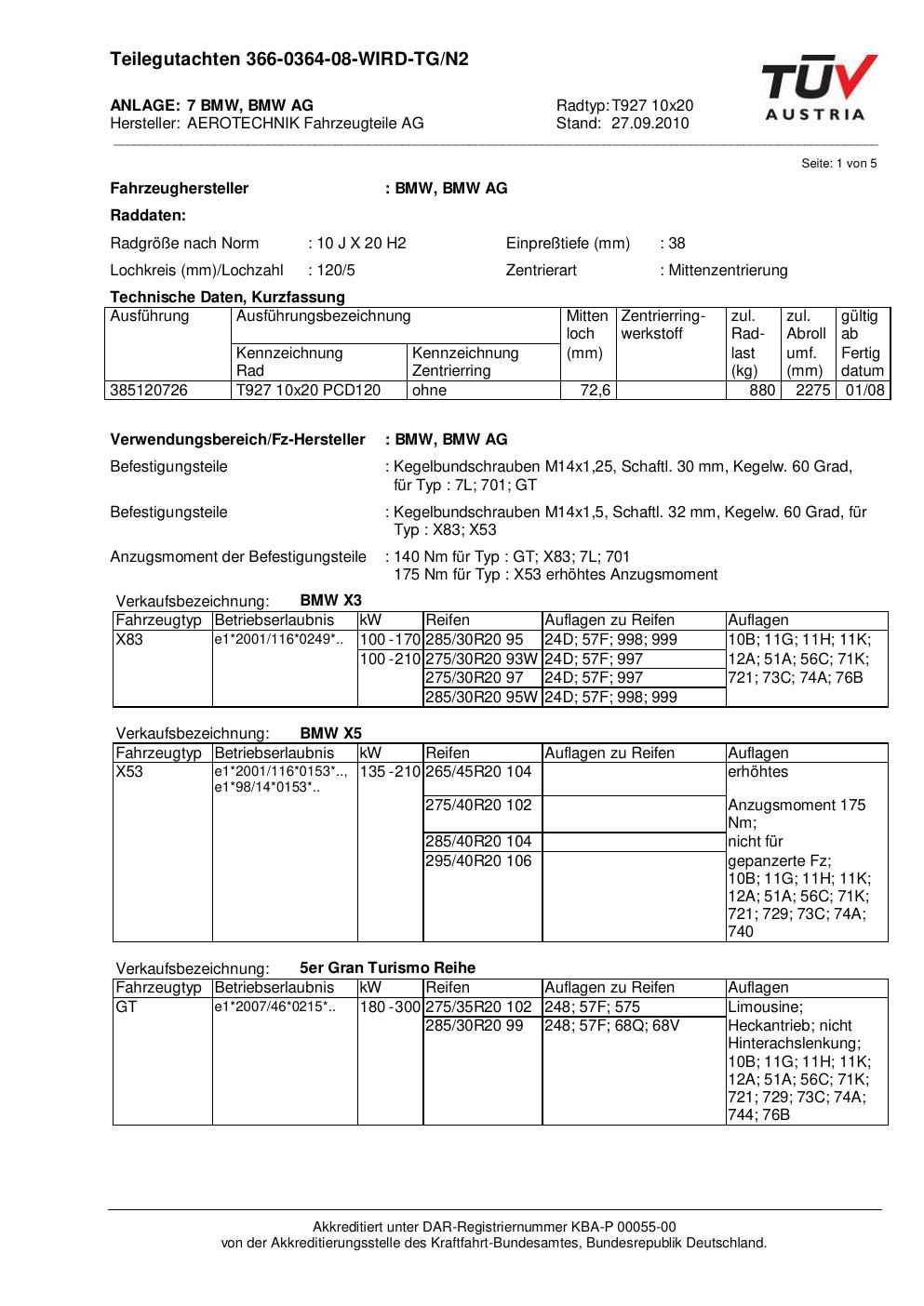 teilegutachten nicht ATS T927 10x20